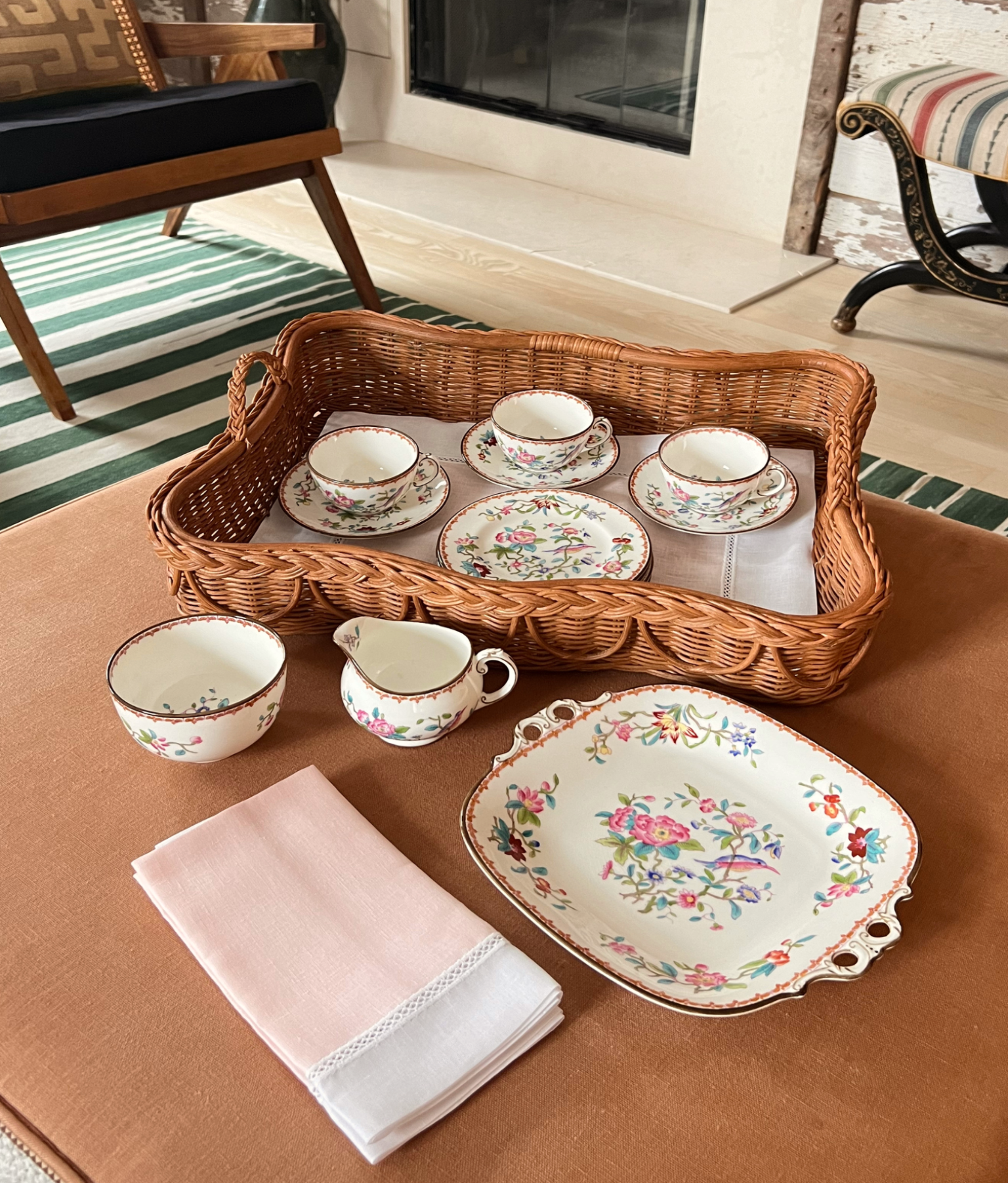 This exquisite vintage tea set, signed Coalport Pembroke, dates to 1930s England and showcases the artistry of hand-painted porcelain. Each piece is adorned with intricate floral motifs, making it as beautiful to behold as it is to use. The set includes six teacups with matching saucers, dessert plates, a cake presentation dish, sugar bowl, and milk jug—ideal for an elegant afternoon tea or as a charming display in a sitting room. A timeless heirloom, perfect for gifting and passing down for generations to come.