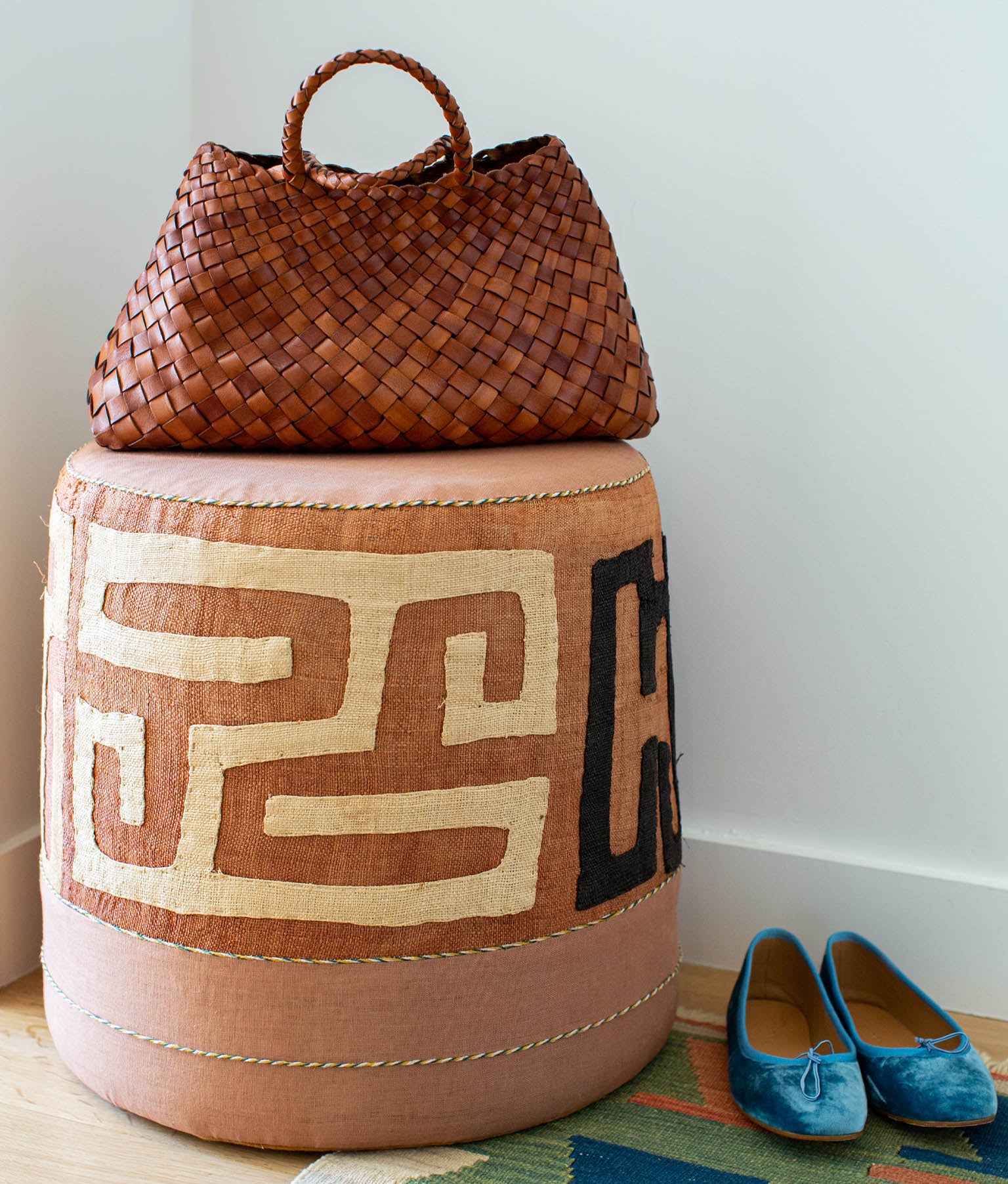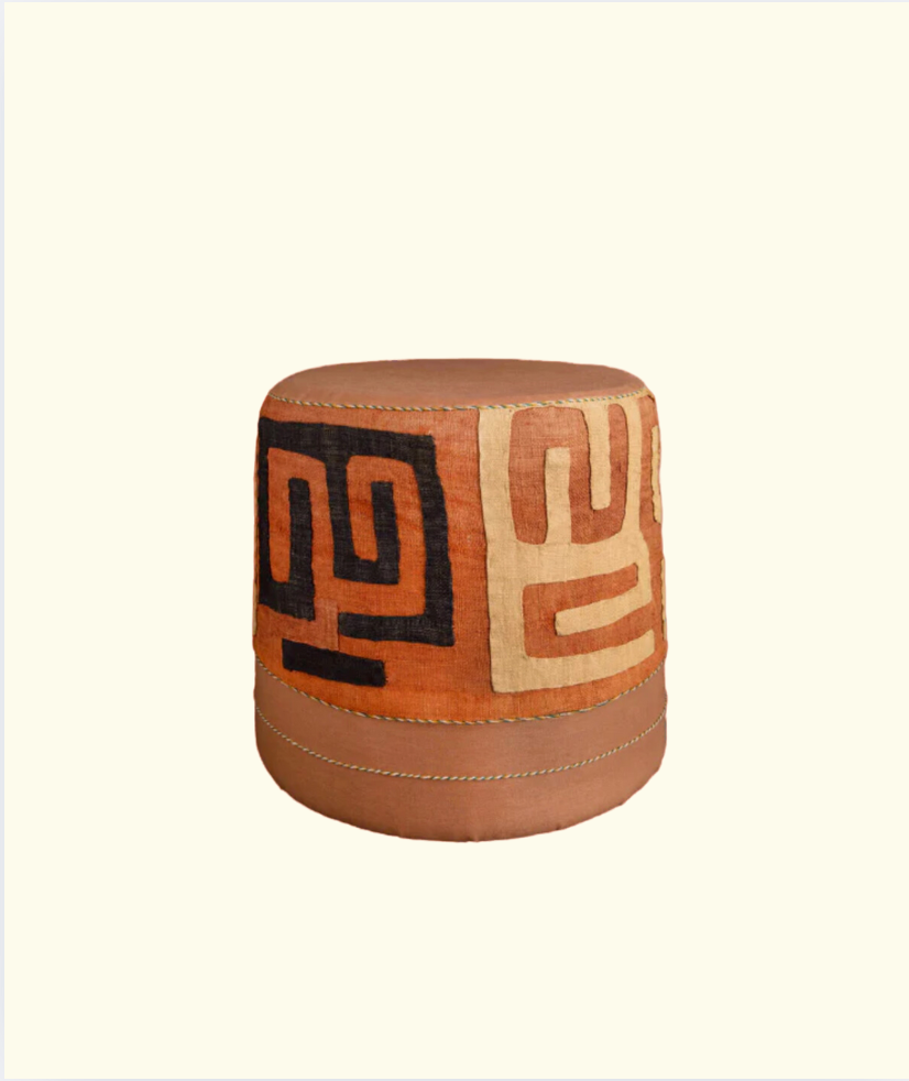 Kick back and relax with our Earth Ottoman. Its mix of sand and tobacco pattern on handmade, antique Kuba cloth will add unique flair to your sitting room. This ottoman is a conversation piece in any room and can even function as a side table.