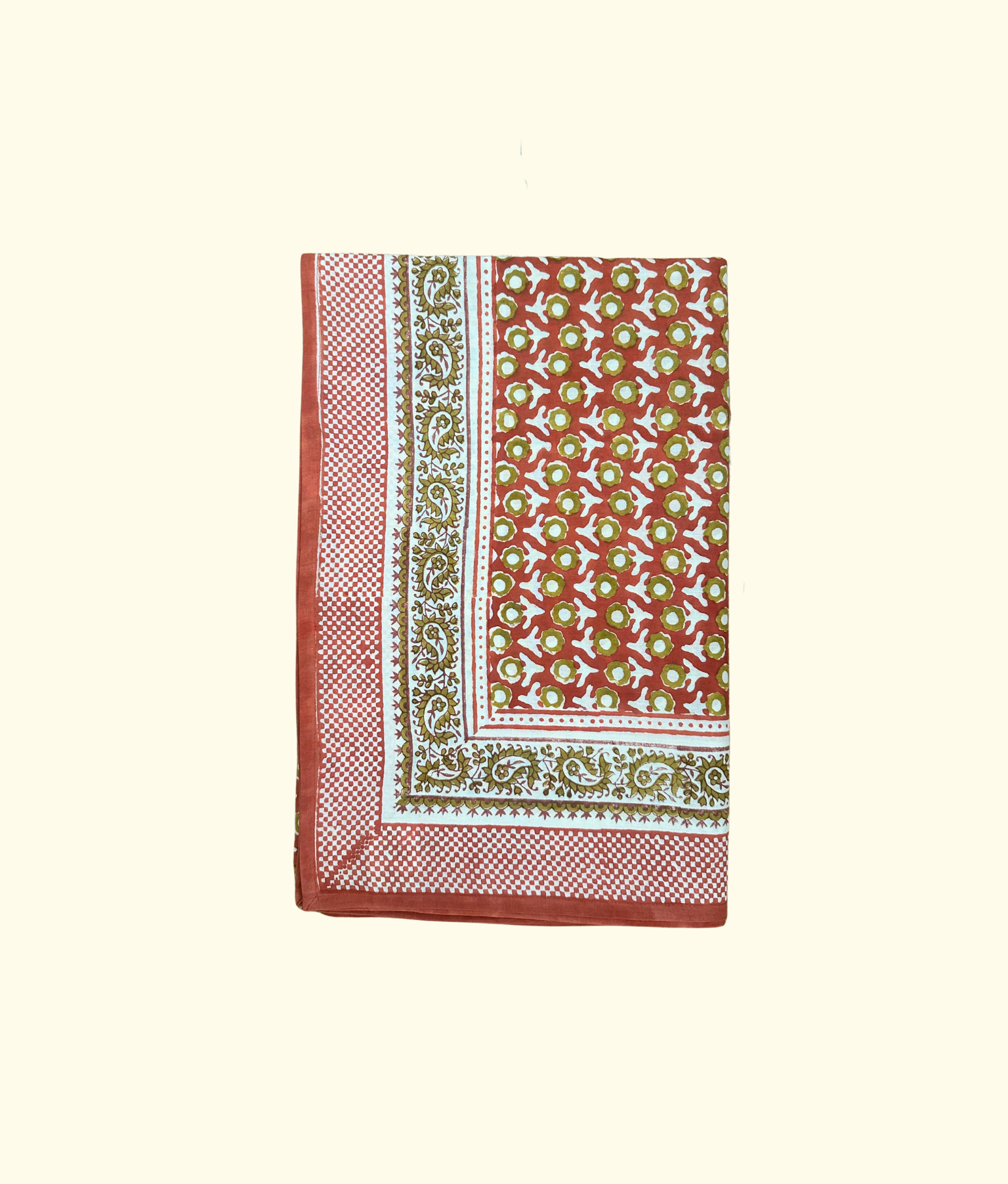 Infused with the charm of traditional Indian artistry, the Lotus Garden tablecloths are hand block-printed in Jaipur by skilled artisans using hand-carved wooden stamps, a centuries-old craft that brings each bloom to life with character and depth.