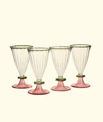 Hand-blown in Cairo, the Palace Walk Glasses transform simplicity into something poetic. A clear fluted bowl catches the light, while a blue trail and olive green-tinted foot meet in delicate balance, graceful, luminous, and full of charm. Each glass carries the subtle irregularities of the handmade, making every pour feel like a quiet celebration.