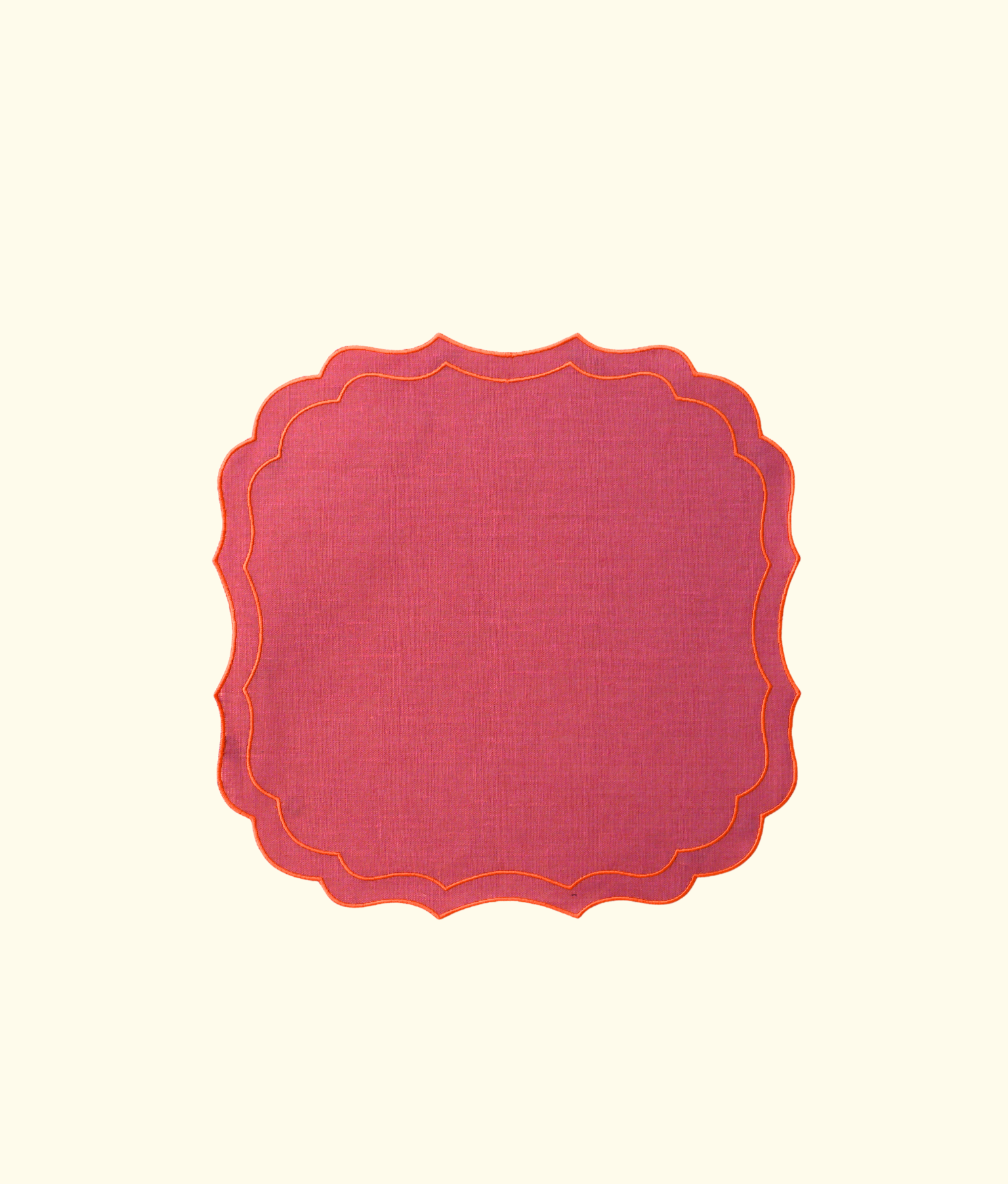 Elevate your table setting with these exquisitely designed scalloped placemats, crafted from coated linen for both beauty and durability. Featuring double embroidery and handcrafted edges, they blend timeless craftsmanship with practical sophistication. The cassis pink, accented with a double ambra orange trim border, add a refined pop of color to any tablescape. The unique shape and striking color combination create an unexpected yet elevated charm. Pair them with the matching napkins for a cohesive and effortlessly stylish dining experience.